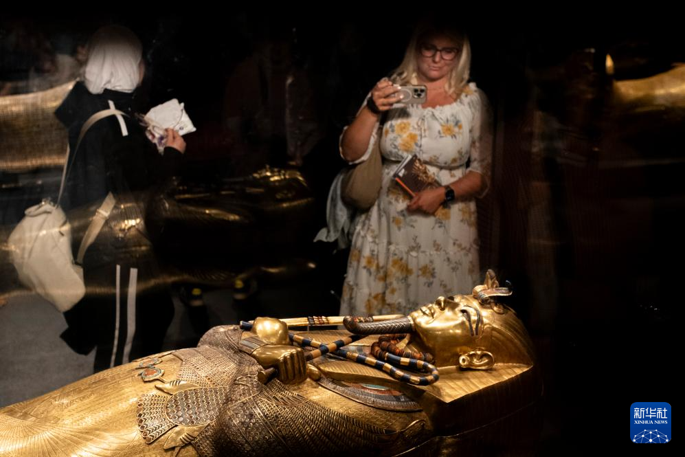 12月20日,游客在埃及吉萨的大埃及博物馆观赏法老图坦卡蒙的黄金内棺。