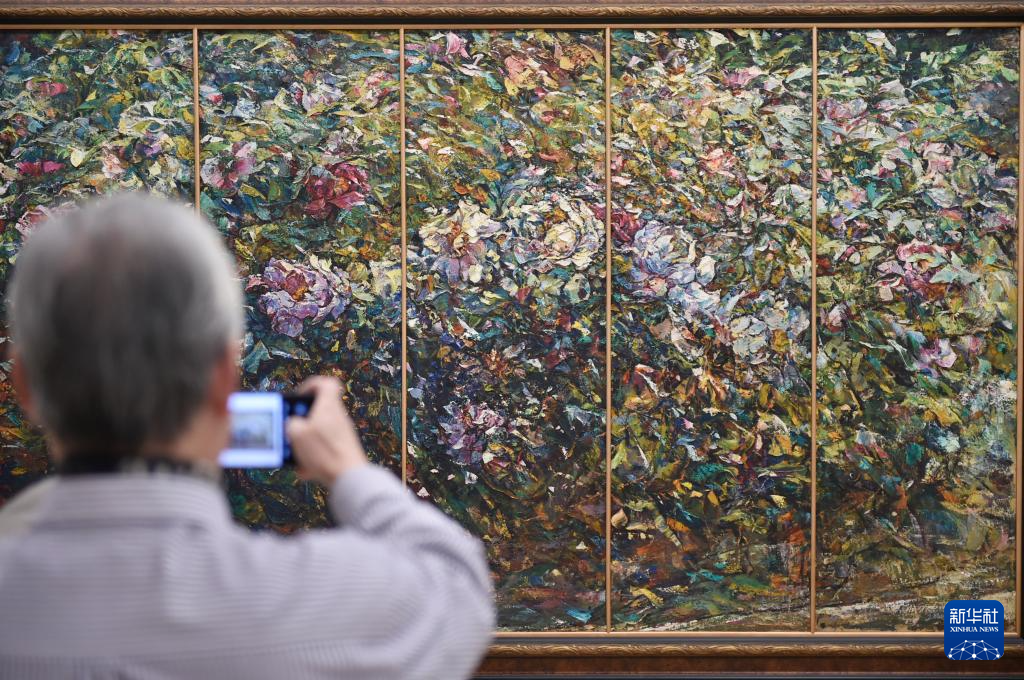 12月21日,参观者在中国美术馆拍摄展出作品《春满牡丹园》。