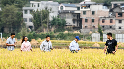 ▲在贵州省麻江县坝芒乡乐坪村,新农人和农业专家及随行学生走在金黄的稻田里。新华社记者 杨文斌 摄