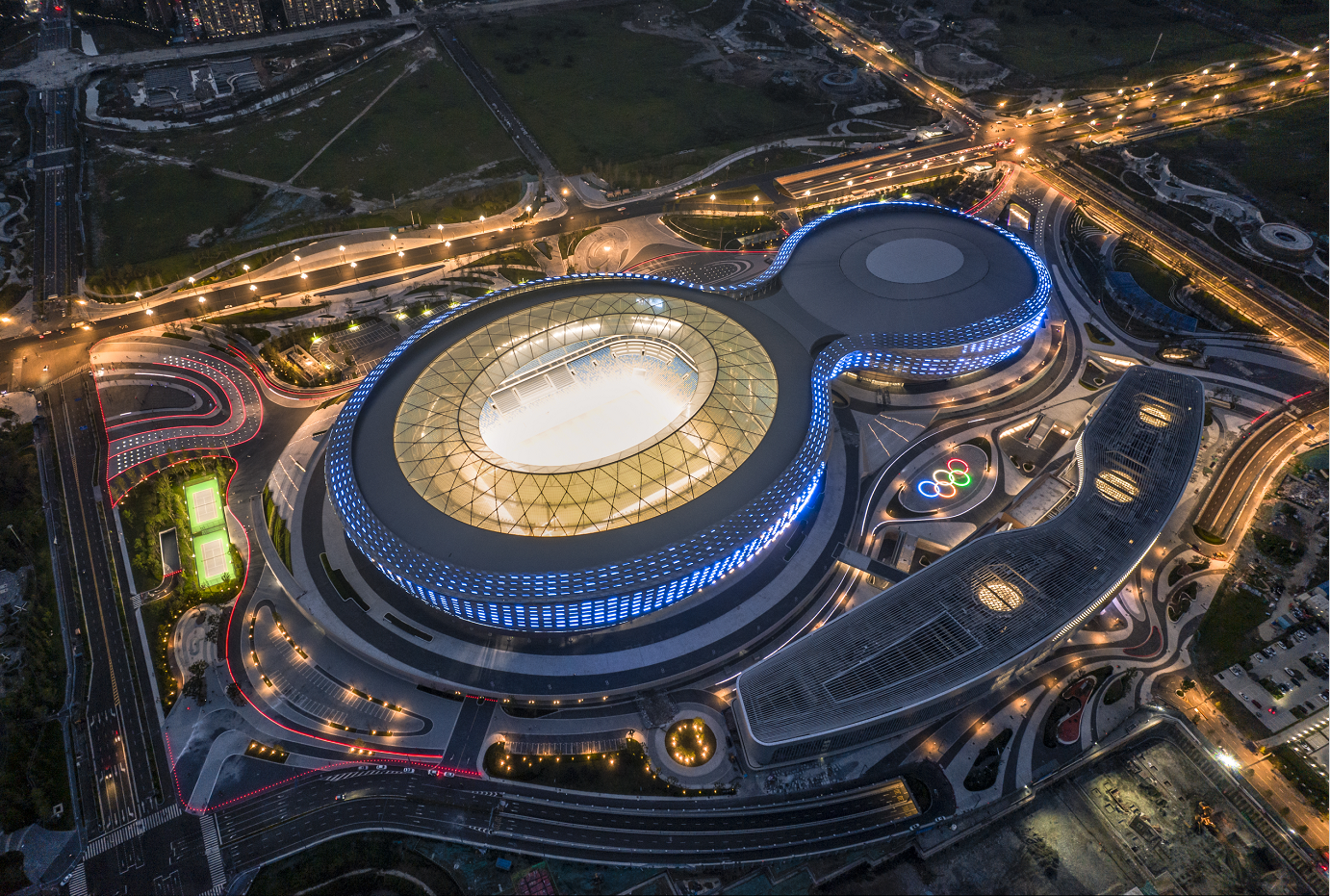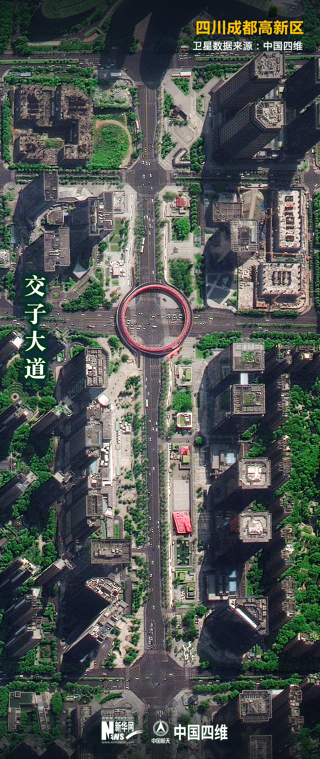成都交子公园商圈的交子大道上,绚丽斑斓的景观桥梁“交子之环”与天府双塔交相辉映。新华社发(成都市高新区宣传部供图)