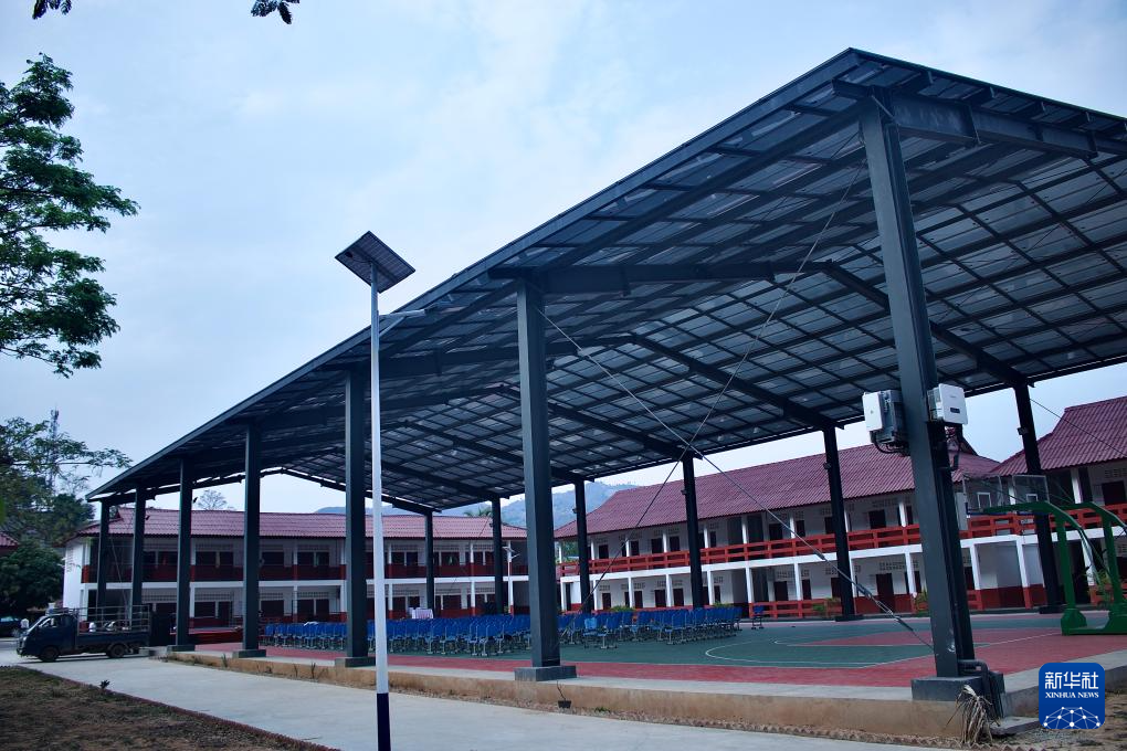 这是3月11日拍摄的老挝乌多姆赛省孟赛高级中学的篮球场。球场顶棚采用的是中国生产的光伏玻璃,并在一侧栏杆上配有储能设备。新华社记者 赵旭 摄