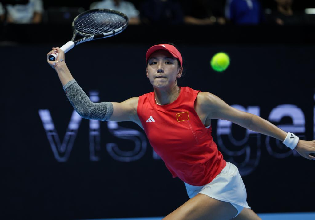 9月16日,中国队选手王欣瑜在第二场单打比赛中回球。最终她不敌意大利队选手保利尼。当日,在广东深圳举行的2025年比利·简·金杯总决赛四分之一决赛中,中国队0比2不敌意大利队,无缘半决赛。新华社记者 毛思倩 摄