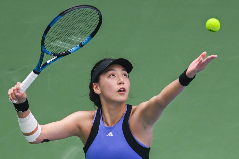 2024年10月11日,王欣瑜在比赛中发球。当日,在2024年WTA武汉网球公开赛女单四分之一决赛中,王欣瑜战胜俄罗斯选手亚历山德洛娃,晋级四强。新华社记者 杜子璇 摄