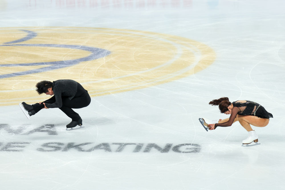 坐在她身边的是老搭档韩聪。这对阔别赛场许久的中国双人滑组合在2022年北京冬奥会后首度携手出现在花滑赛场上。这次亮相,距离他们夺得冬奥金牌已经过了三年零八个月。