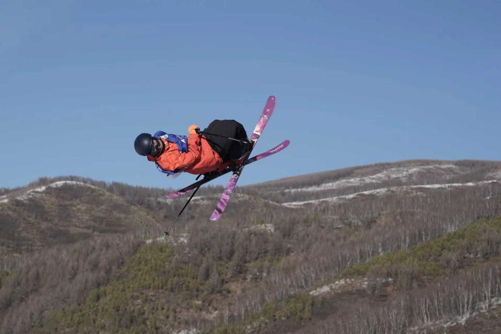 中国自由式滑雪运动员刘梦婷在比赛中起跳