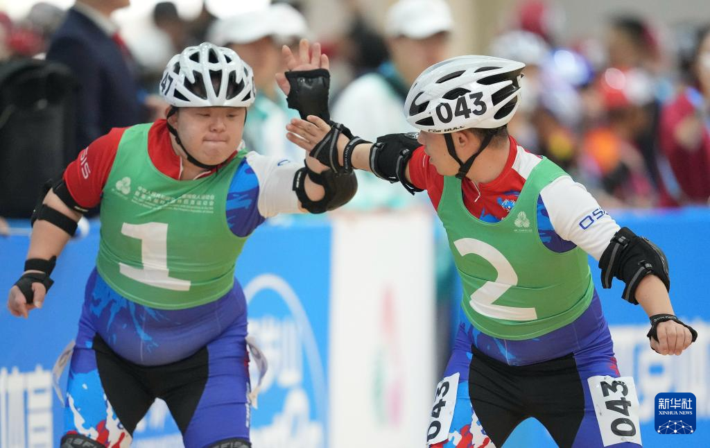 12月10日,在特奥轮滑男子2X100米接力预赛M13组比赛中,黑龙江五队选手潘琳(右)与队友王征击掌接力。