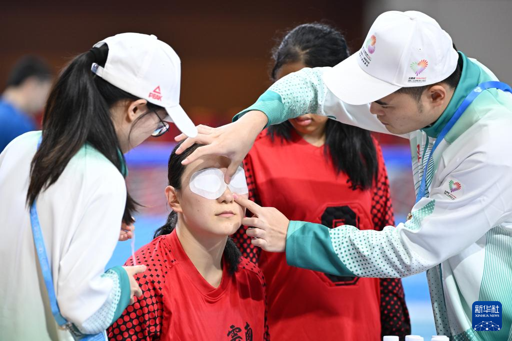12月10日,志愿者在比赛开始前为云南队运动员张西伶(中)贴眼罩。