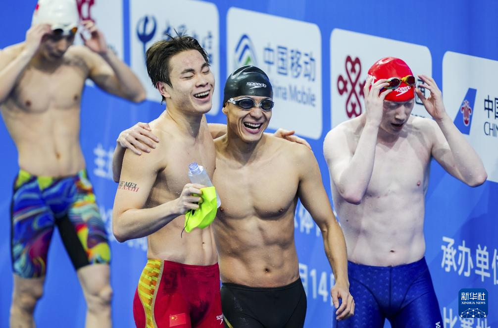 12月10日,广东一团队选手黄学亮(右三)在男子100米自由泳S13级决赛后与天津队选手刘玉涛(右二)交流。最终,黄学亮获得冠军,刘玉涛获得季军。