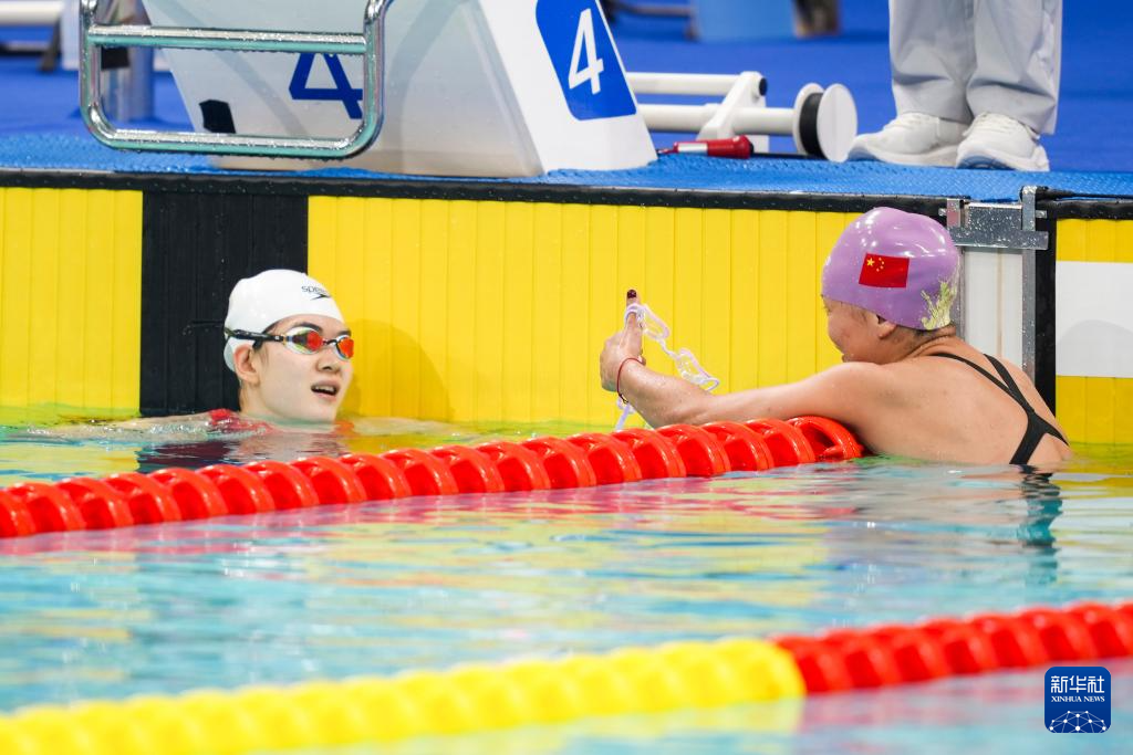 12月10日,云南队选手郑婷婷(左)在女子100米仰泳S8级决赛后与队友鲁韦元交流。最终,她们分别获得冠军和季军。