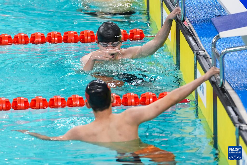 12月10日,湖北队选手福清(上)在男子100米仰泳S15级预赛后与队友邓鹏秸使用手语交流。