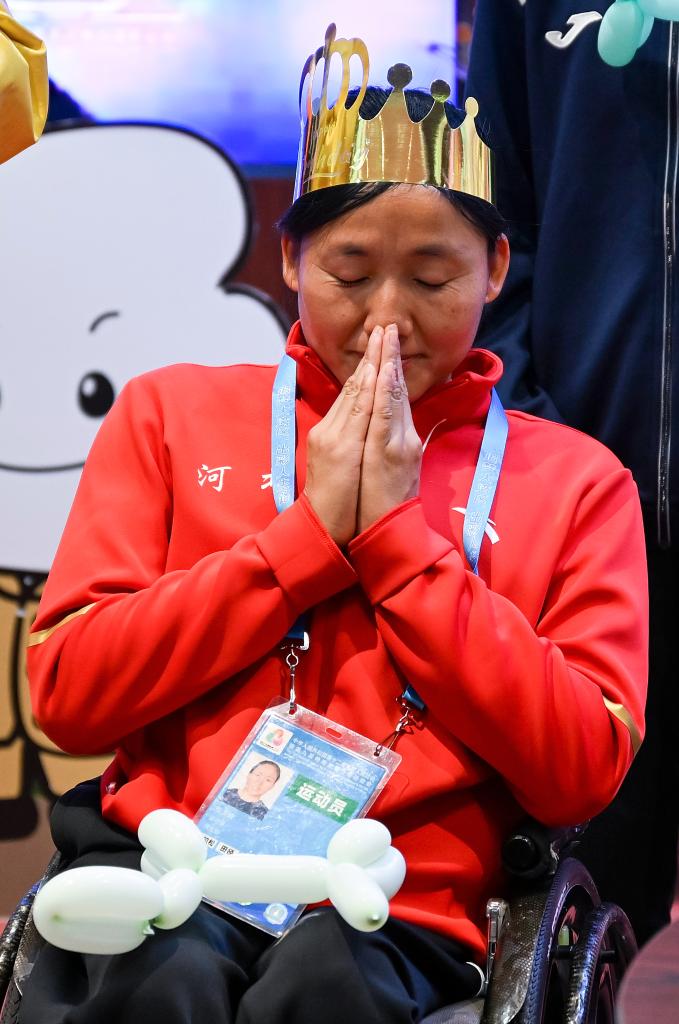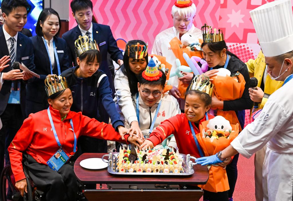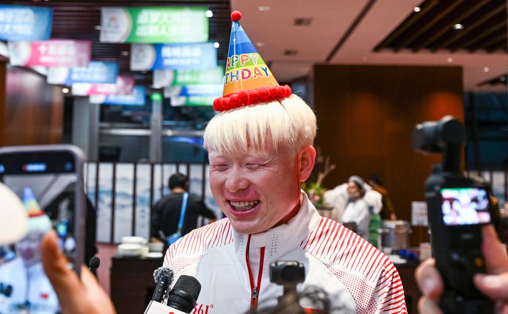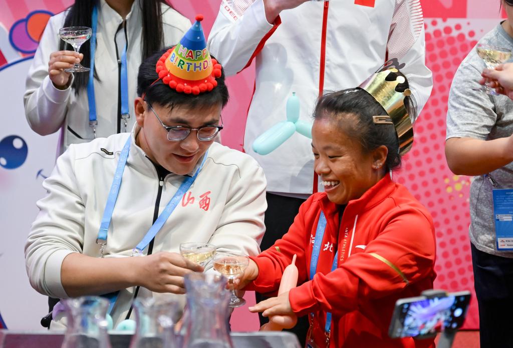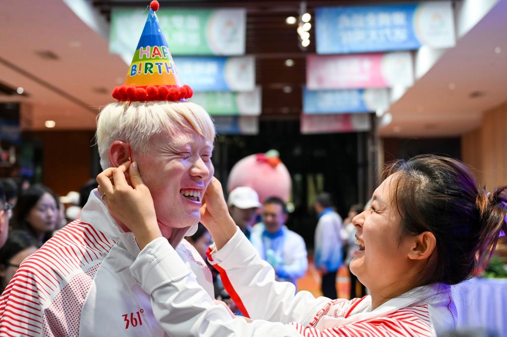 ↑12月10日,工作人员为河北队运动员周洪转(前)佩戴生日帽。新华社记者 陈浩明 摄