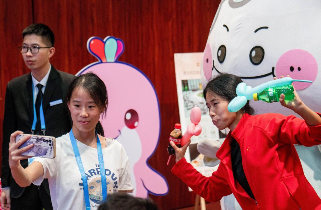 ↑12月10日,运动员在活动现场与吉祥物合影留念。新华社记者 陈浩明 摄