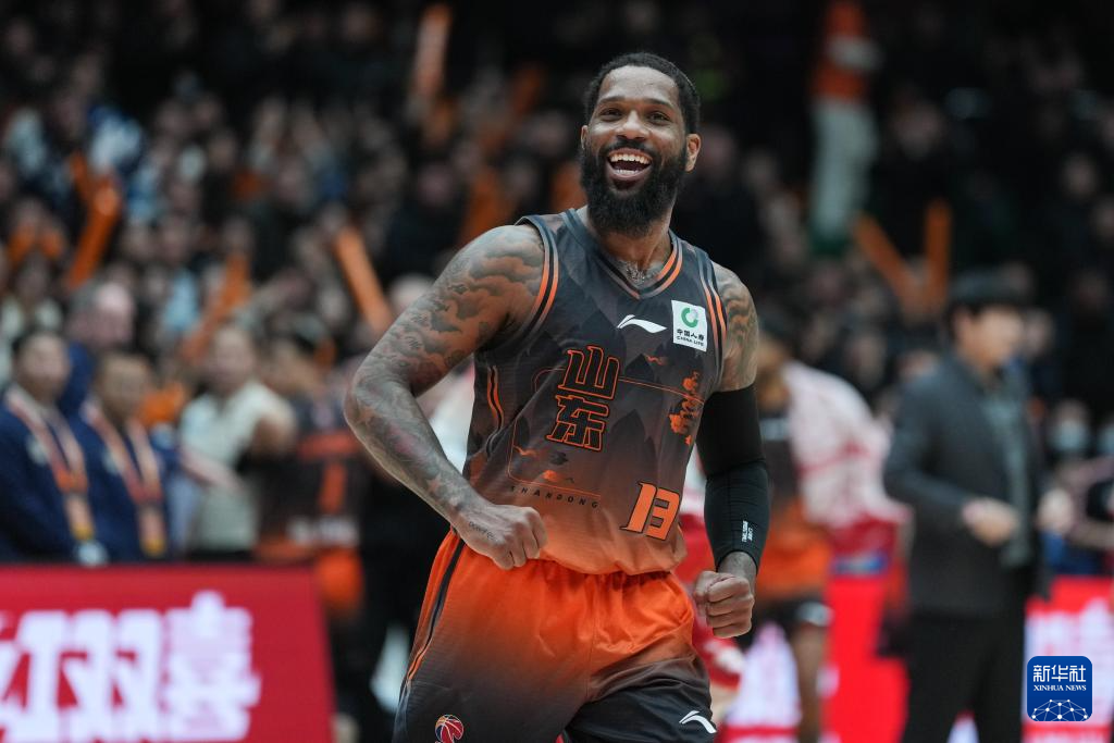 1月25日,山东高速队球员鲍威尔在比赛中庆祝进球。