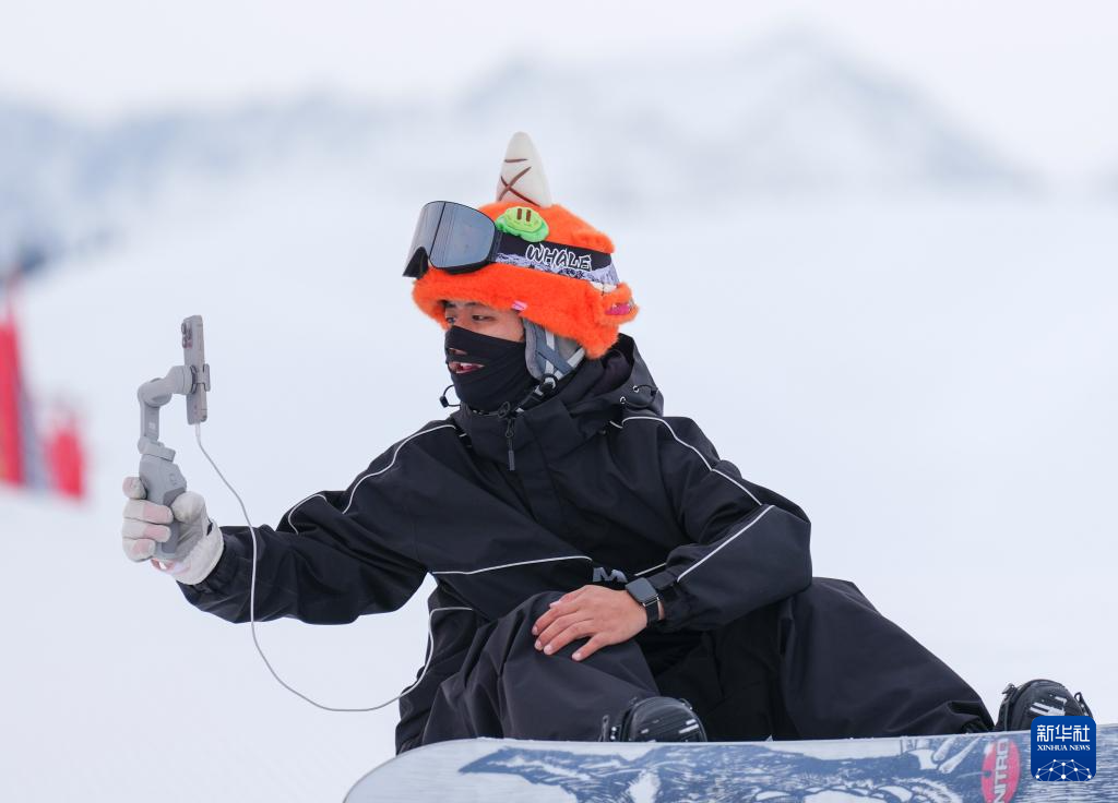 1月25日,主播在新疆那拉提哈茵赛滑雪度假区直播。