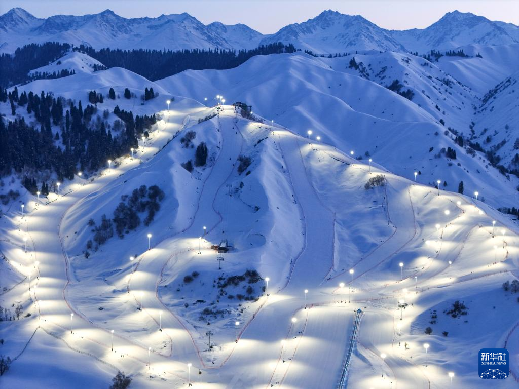 1月24日傍晚时分,新疆那拉提哈茵赛滑雪度假区亮灯,即将开启夜场营业(无人机照片)。