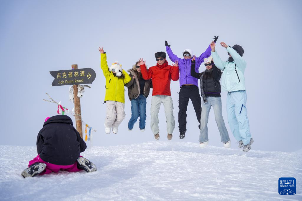 2月4日,滑雪爱好者在新疆阿勒泰地区禾木吉克普林国际滑雪度假区拍照留念。