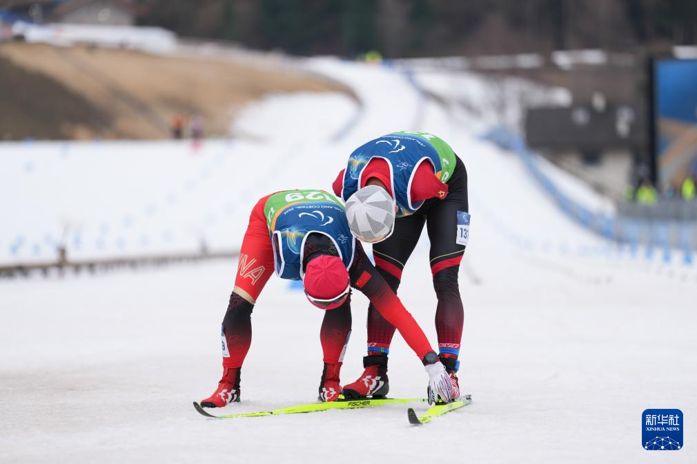 3月11日,中国选手袁明寿(左)帮助黄灵心卸下雪板。