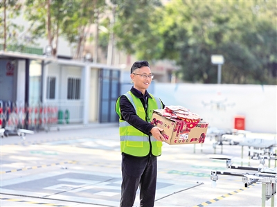 图为深圳丰翼无人机运营中心工作人员准备配送年货车厘子。(企业供图)