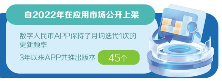 记者了解到,自2022年1月在应用市场公开上架以来,数字人民币APP始终以提升用户体验为核心持续“快跑”迭代,保持了月均迭代1次的更新频率,3年以来APP共推出45个版本。