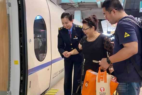 国庆中秋假期的一天,韩文文正在服务台盯岗,接到一位旅客的求助来电,余女士的外婆独自一人乘坐G32次到达北京,由于其赶不及到车站接站,老人年纪大又不会普通话,特别担心着急。“您放心,把具体座位号和老人的联系方式告诉我,我先帮助您接老人。”韩文文有条不紊地记录着相关信息。中午12时20分,当列车缓缓停靠在站台时,韩文文立即锁定老人,并呼唤老人的名字,核对好身份后送老人出站,将老人交到刚赶到停车场的余女士手中。“太感谢你了,真的像是家人一样。”