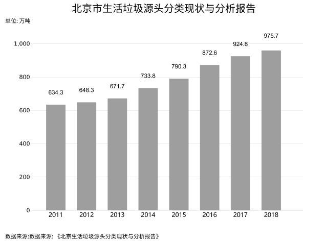 ??? 近年來, 每年垃圾產生量仍以明顯的速度增長,年均增長達到5.5%,增長態勢嚴峻。在垃圾體量如此龐大的情況下,北京市每天會產生近2.6萬噸生活垃圾,人均每天1.2千克。