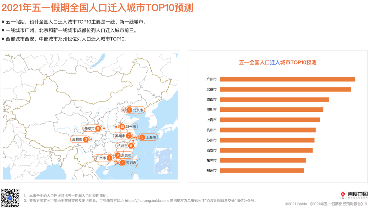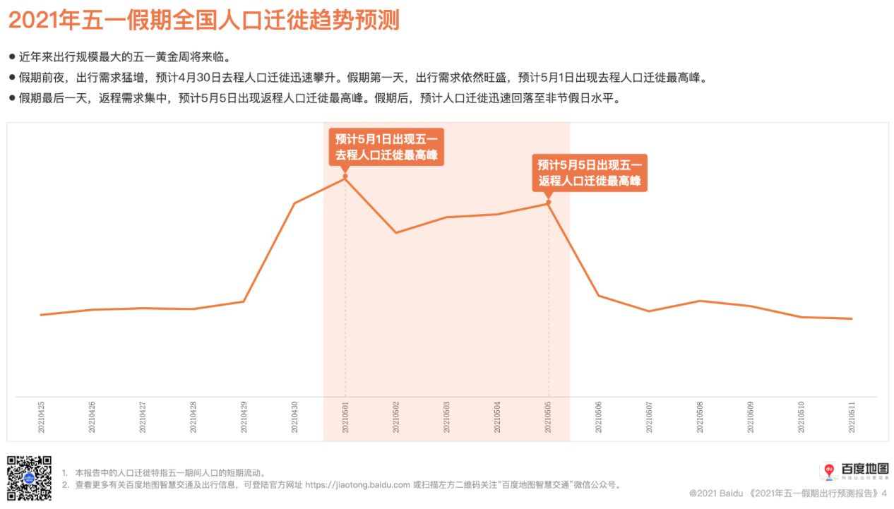 ????? 今年“五一”假期繼續延續“加長版”,5天長假點燃了眾多消費者的出游熱情。根據中國旅游研究院的預測,今年“五一”國內旅游出游有望達到2.2億人次,按可比口徑甚至超過疫前同期水平。根據百度地圖《2021年五一假期出行預測報告》,近年來出行規模最大的“五一”黃金周將來臨。預計5月1日出現五一去程人口遷徙最高峰。