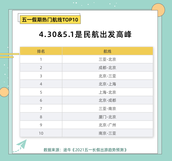????? 根據途牛發布的《2021五一長假出游趨勢預測》數據,在旅游快速復蘇、“加長版”假期、旅游優惠活動等多重利好下,今年“五一”計劃出游的人數將暴增。出行人數的激增使多條熱門航線票價大漲,4月30日和5月1日兩天是民航出發最高峰,而返程高峰將出現在5月4日、5日的假期末尾。
