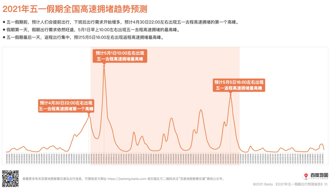????? 假期前,預計人們會提前出行,下班后出行需求開始增多,預計4月30日22:00左右出現五一去程高速擁堵的第一個高峰。