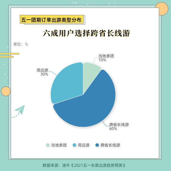 ????? 《報告》顯示,截至目前,預訂出游的訂單中,有60%為跨省長線游,其中,有37%的訂單行程天數超過5天,拼假出游的游客不在少數。