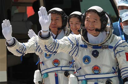 航天員景海鵬、劉旺、劉洋向大家致禮