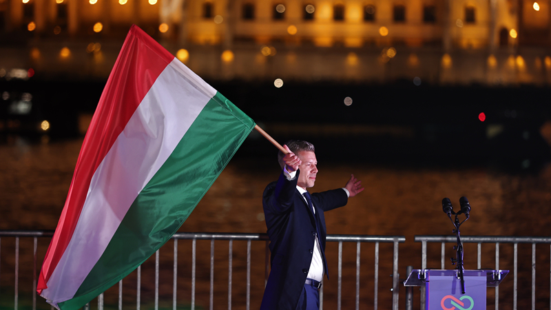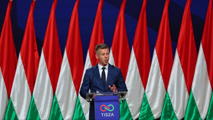 匈牙利蒂薩黨主席毛焦?fàn)柵e行國(guó)際新聞發(fā)布會(huì)