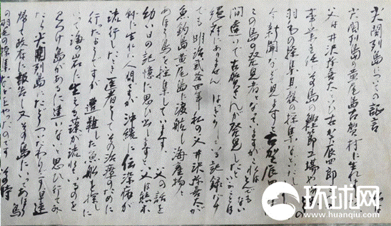 ????伊澤彌喜太長女伊澤真伎1901年2月生于黃尾嶼。她于1972年1月8日口述并請人代筆,用毛筆寫下一份《關于尖閣列島的證言》,其中披露了其父伊澤彌喜太1891年首次登島開發一事,并明確指出釣魚島“應該歸還給它的故鄉——中國”。筆者現將部分證言的譯文公諸于眾:“我出生于尖閣列島(譯者注:釣魚島列島)的黃尾島古賀村。父親是井澤彌喜太(注:經核實應為伊澤彌喜太,屬于同音字記錄筆誤)。他曾任古賀辰四郎的業務主任,在該島經營干制鰹魚工廠,也采集信天翁的羽毛以及貝殼等。現在報紙等報道稱古賀辰四郎是第一個發現該島嶼的人,這是彌天大謊,是絕對不可能的事情。因為有明文記錄可以證明,我父親于明治二十四年(1891年)航行至魚釣島(即釣魚島)、黃尾島,打撈海產品和采集信天翁的羽毛。……父親登島后曾對其進行調查,期間在一個洞穴里發現兩具身著中國服裝的骸骨?,F在看來,在父親登島之前可能已有中國人達到此處。父親和古賀相識是因為古賀當時很有錢,他曾主動向父親提出:‘你在沖繩經營事業需要資金,我們一起合作怎么樣?!驗槭枪刨R出資,所以名義上是古賀經營,但一切事務實際上都是由我父親全權負責的。古賀也曾說過,他允許我父親在那里自主隨意地經營。