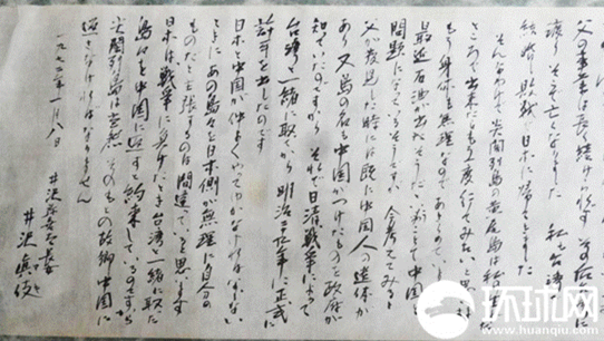 ???? ……在我父親發現該島嶼的時候就已經有中國人的遺體,而且當時的日本政府也知道中國早已經對該島嶼命過名,后來通過日清戰爭(譯者注:甲午戰爭)將其與臺灣一同搶奪過來,并于明治二十九年(1896年)正式編入日本的版圖。