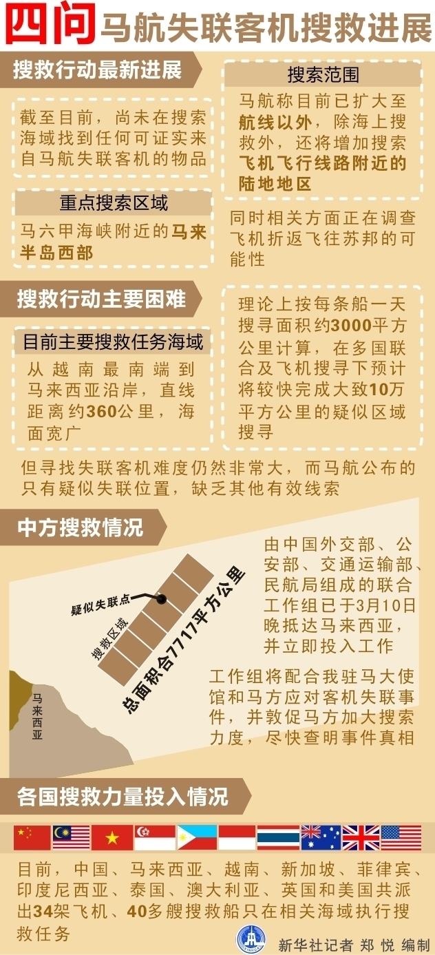 ????目前,中國、馬來西亞、越南、新加坡、菲律賓、印度尼西亞、泰國、澳大利亞、英國和美國共派出34架飛機(jī)、40多艘搜救船只在相關(guān)海域執(zhí)行搜救任務(wù)。