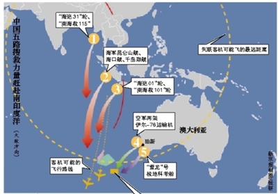 中國外交部發言人洪磊21日在介紹馬航失聯客機搜尋情況時表示,中澳保持密切溝通和協調,中方派遣有關的軍機和船艦前往相關海域得到了澳方的支持和配合。他說,交通運輸部進一步優化后續搜救方案。中國海上搜救中心指示南下編隊“海巡01”輪、“南海救101”輪繼續按原定搜尋方案向圣誕島以南部分的我方南部搜尋區域搜索前進,并逐漸向發現疑似失聯客機殘骸海域靠近;北上編隊“海巡31”輪、“南海救115”輪逐漸向我方南部搜尋區前進,從北向南開展搜尋工作。目前,海軍昆侖山艦、??谂?、千島湖艦等已趕赴南印度洋疑似發現失聯客機殘骸的海域。