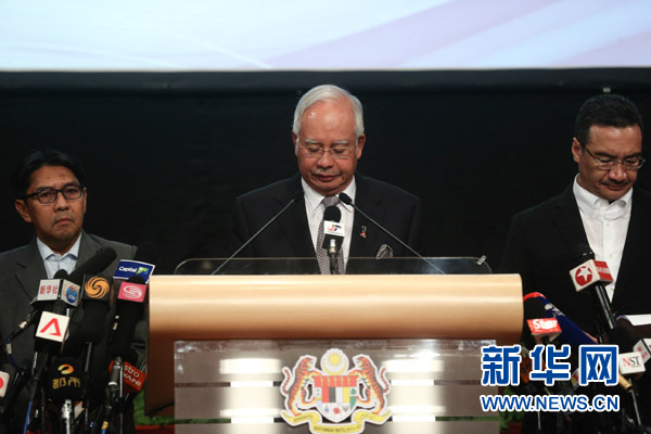 3月24日,在馬來西亞吉隆坡,馬來西亞總理納吉布(中)就馬航失聯(lián)航班舉行記者會。馬來西亞總理納吉布當日在吉隆坡宣布,根據(jù)最新信息,馬航失聯(lián)航班MH370在南印度洋墜毀。 新華社記者 王申 攝
