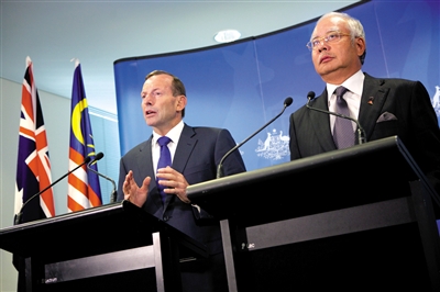 發(fā)布會持續(xù)了10分25秒,澳大利亞總理阿博特和馬來西亞總理納吉布先后發(fā)言。雙方總理確認(rèn),澳大利亞正式成為馬航搜尋的主導(dǎo)國,并開始參與調(diào)查。