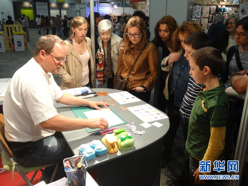 ????4月26日,巴塞羅那第一屆“手工藝品節”(Handmade Festival Barcelona)上,一些參展者向游客介紹如何進行手工制作。