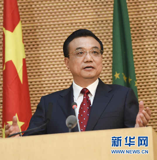 ??? 5月5日,國務(wù)院總理李克強在位于亞的斯亞貝巴的非洲聯(lián)盟總部發(fā)表題為《開創(chuàng)中非合作更加美好的未來》的演講。 新華社記者 李學仁 攝
