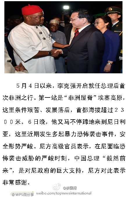 ????新華網北京5月7日電 據新華社“新國際”微博報道,5月4日,李克強開啟就任總理后首次非洲之行。繼首站訪問條件艱苦、發展落后的“非洲屋脊”埃塞高原后,6日晚,他又馬不停蹄地來到面臨恐怖襲擊威脅的尼日利亞。尼方高級官員表示,中國總理“毅然前來”,是對尼政府的巨大支持,尼方對此表示非常感謝。