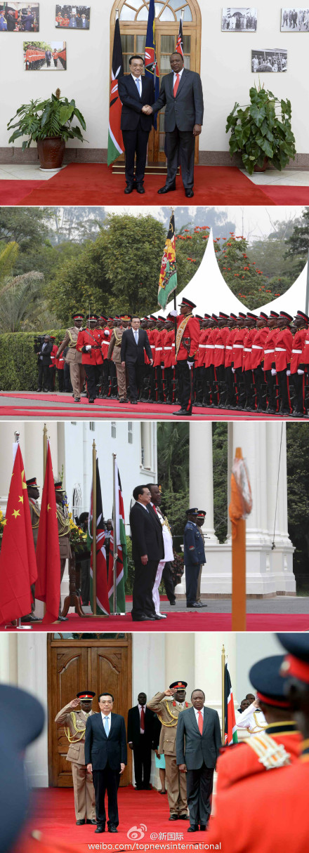 ????新華網(wǎng)北京5月10日電? 據(jù)新華社“新國際”微博報道,肯尼亞總統(tǒng)肯雅塔10日上午在國家宮為中國總理李克強舉行隆重歡迎儀式。現(xiàn)場鳴放禮炮,軍樂隊奏兩國國歌。李克強檢閱了儀仗隊。