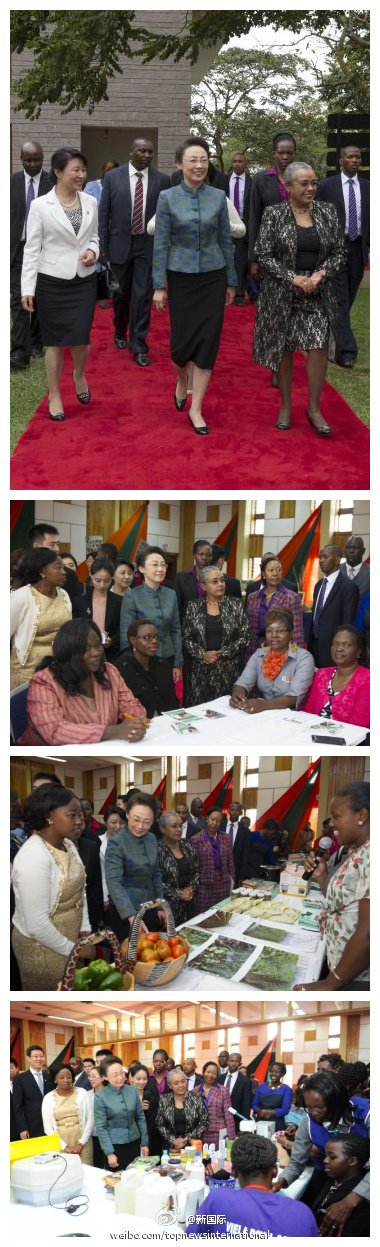????新華網(wǎng)北京5月11日電 據(jù)新華社“新國際”微博報(bào)道,10日,李克強(qiáng)總理夫人程虹在肯尼亞總統(tǒng)夫人和副總統(tǒng)夫人的陪同下參觀了快樂婦女組織。該組織用小額貸款支持農(nóng)村婦女種植蔬菜、制作手工藝品等以提高家庭收入。程虹與受益于該組織的一些婦女交流,贊揚(yáng)她們自食其力、補(bǔ)貼家用,還現(xiàn)場購買手工藝品以示支持。