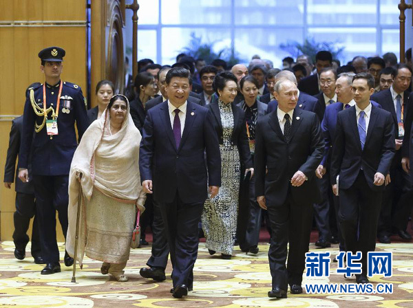 ??? 5月20日,國家主席習近平在上海國際會議中心舉行宴會,代表中國政府和人民,歡迎前來出席亞洲相互協作與信任措施會議第四次峰會的各國貴賓。這是習近平和彭麗媛同各國貴賓一起步入宴會廳。新華社記者 蘭紅光 攝