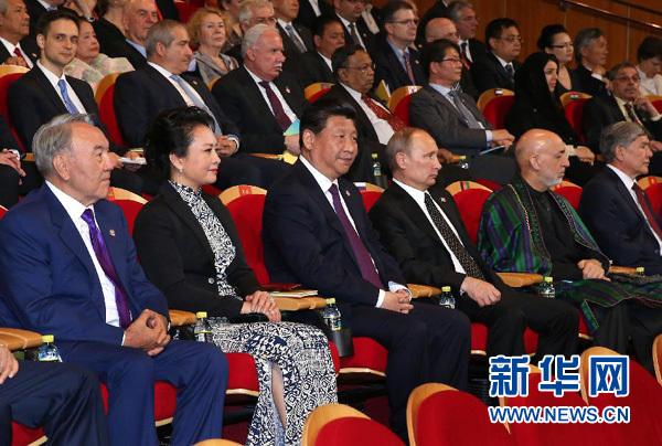 ??? 5月20日,國家主席習近平在上海國際會議中心舉行宴會,代表中國政府和人民,歡迎前來出席亞洲相互協作與信任措施會議第四次峰會的各國貴賓。歡迎宴會后,“團結和諧的亞洲-攜手向明天”-亞洲相互協作與信任措施會議第四次峰會文藝晚會在上海大劇院舉行。這是習近平和彭麗媛同與會各國貴賓共同觀看文藝晚會。新華社記者 龐興雷 攝