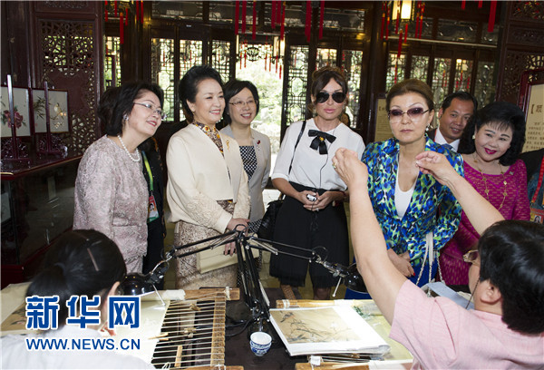 ????彭麗媛陪同來賓們觀看金山農民畫、面塑、顧繡、木版水印、扎染,她們邊看邊聽取上海工藝美術博物館負責人的介紹,饒有興趣地欣賞非物質文化遺產傳承人的絕活兒,對民間藝術家們的精湛技藝贊不絕口。