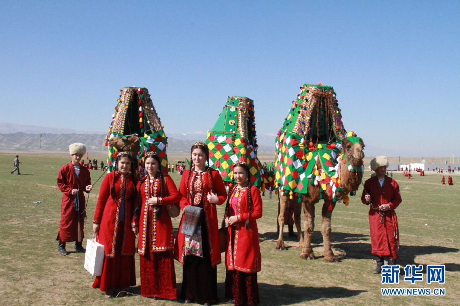 ????記者還看到過20來頭駱駝組成的駝群,其中頭駱身上綁著個布袋。駱駝低頭吃草,頭駝警覺地給它們站崗放哨。不一會兒,一些駱駝走到頭駝身前,向它施貼臉禮,頭駝一一回禮。當記者試圖靠近時,頭駝發出低沉的怪聲,群駝迅速抬起頭來,慢慢地朝遠方走去。在過節時,牧民小伙穿上紅色條狀長袍,頭戴白色羊羔皮帽,手牽的駱駝身上裹著人工織的毛毯,背上架著花轎,花轎中坐著美麗少女,少女頭戴小帽,梳著兩根長辮,身穿蓋過腳面的長裙。這是在給節日助興。同時,這也是土庫曼斯坦民族婚禮中迎娶新娘的一個縮影。在現實生活中,城市人很少見到駱駝。于是在各種活動中,跟打扮得如此漂亮的駱駝合影也是一件趣事。
