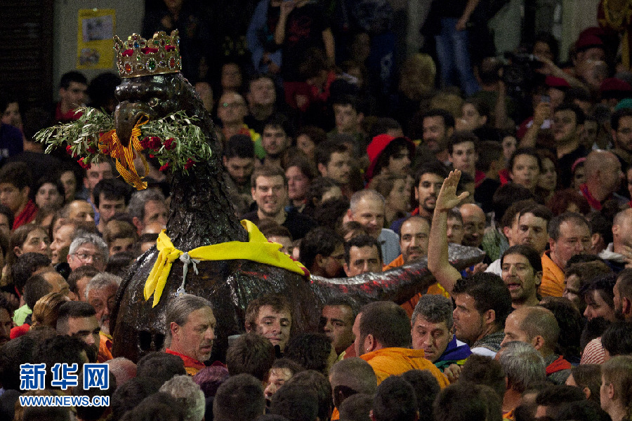 西班牙貝爾加(Berga)市的La Patum節上,頭戴皇冠的老鷹玩偶穿過狂歡的人群。
