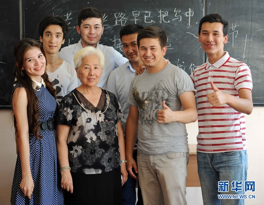 ??? 6月25日,烏茲別克斯坦首都塔什干,烏國立世界語言大學教室,70歲的董富華在向三年級學生上漢語課。新華網記者 沙達提攝。