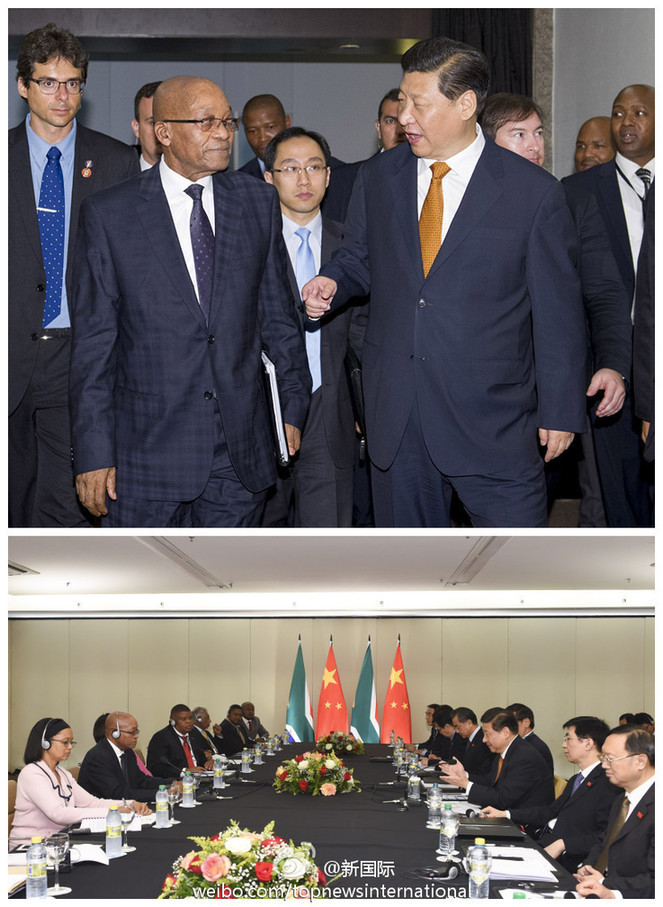 ???? 新華網(wǎng)北京7月15日電 據(jù)新華社“新國(guó)際”微博報(bào)道,習(xí)近平主席14日在巴西會(huì)見南非總統(tǒng)祖馬。習(xí)近平指出,和平與發(fā)展是非洲的主題。中非是命運(yùn)共同體,我們?cè)敢馔侵迖?guó)家分享發(fā)展經(jīng)驗(yàn),積極參與非洲和平安全事務(wù),推進(jìn)非洲跨國(guó)跨區(qū)域互聯(lián)互通項(xiàng)目,為促進(jìn)非洲一體化作出更大貢獻(xiàn)。?