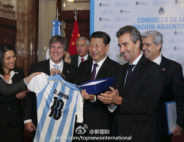 ????新華網北京7月20電 據新華社“新國際”微博報道,正在阿根廷進行國事訪問的國家主席習近平當地時間19日上午會見了副總統兼參議長布杜和眾議長多明格斯。會見后,布杜向習近平主席贈送了阿根廷國家足球隊10號球衣。在剛結束的世界杯比賽中,阿根廷國家隊10號球員為梅西。